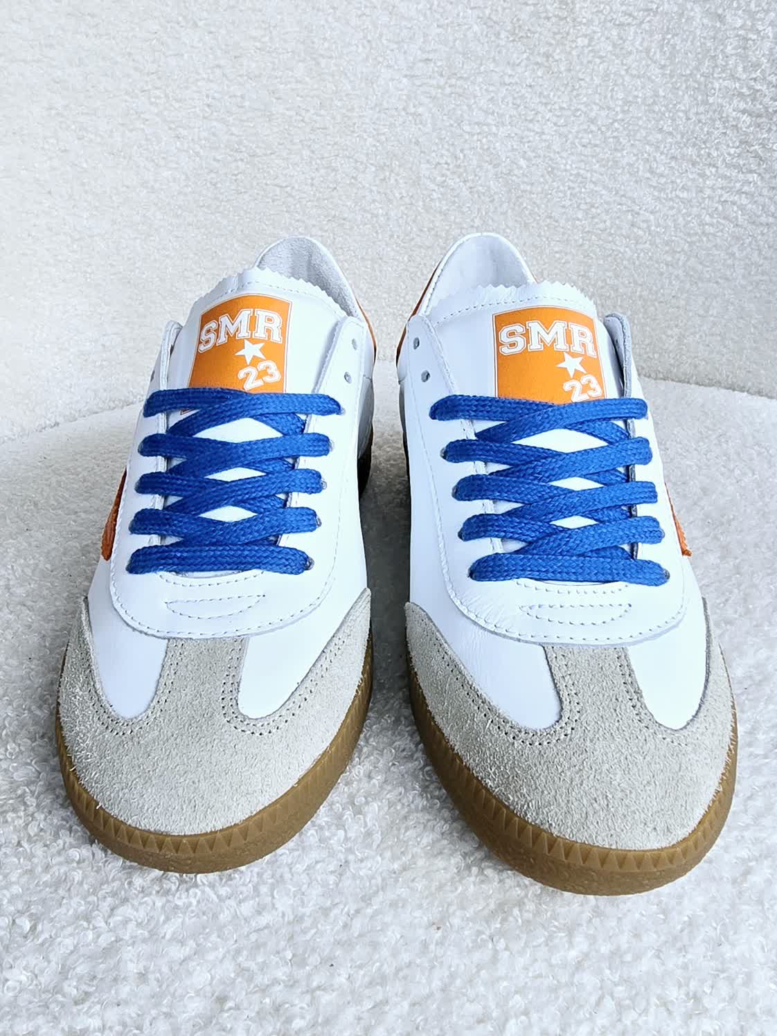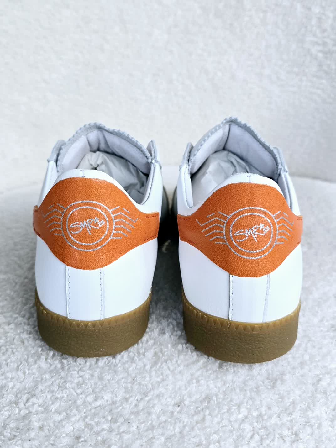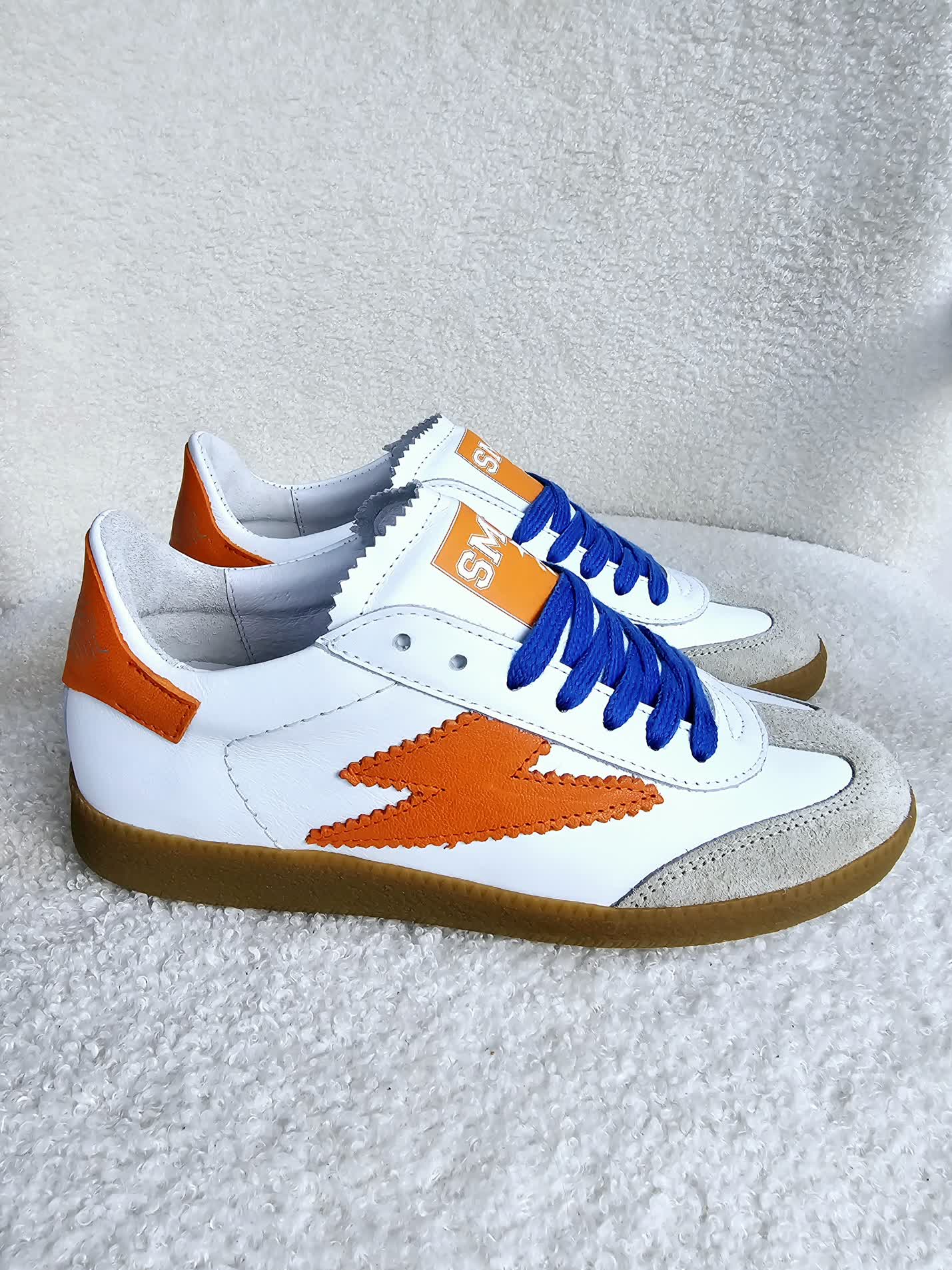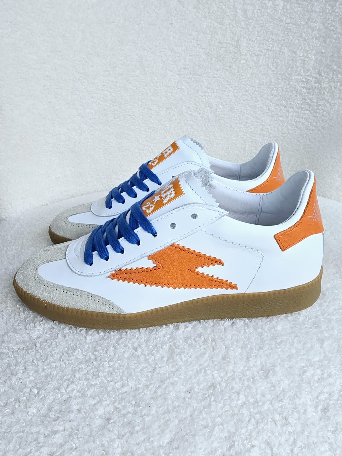 Design élégant et dynamique : Une baskette blanche en cuir extérieur et intérieur, mettant en valeur des détails orange qui apportent une touche de vivacité.