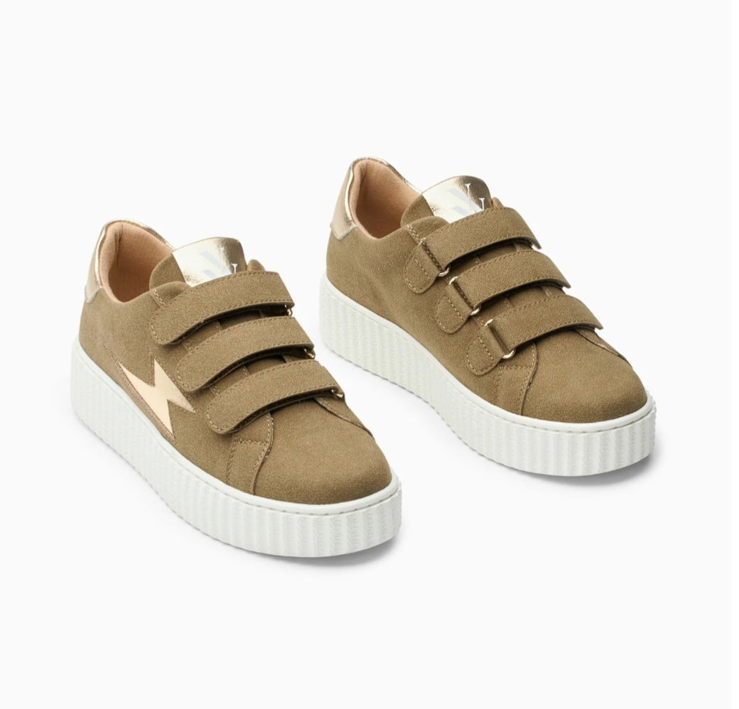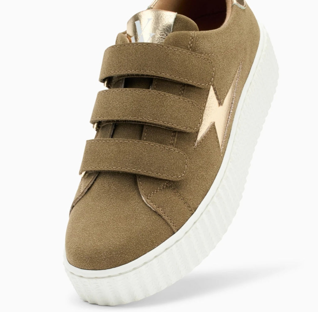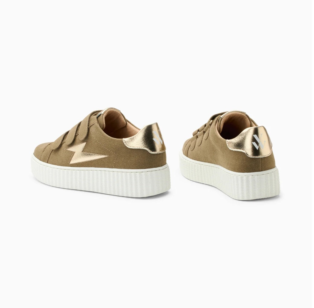 - Découpe en forme d'éclair et patch arrière en similicuir texturé or