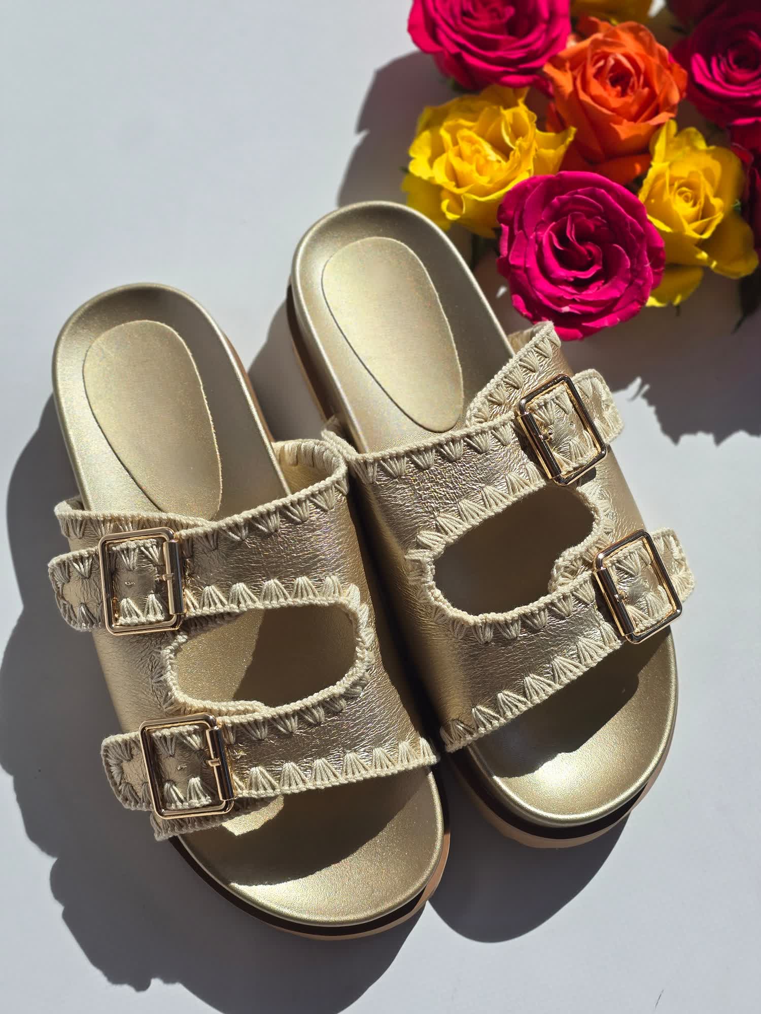 Double bride ajustable : Chaque bride est équipée d’une boucle dorée réglable, s’ajustant parfaitement à tous les types de pieds.