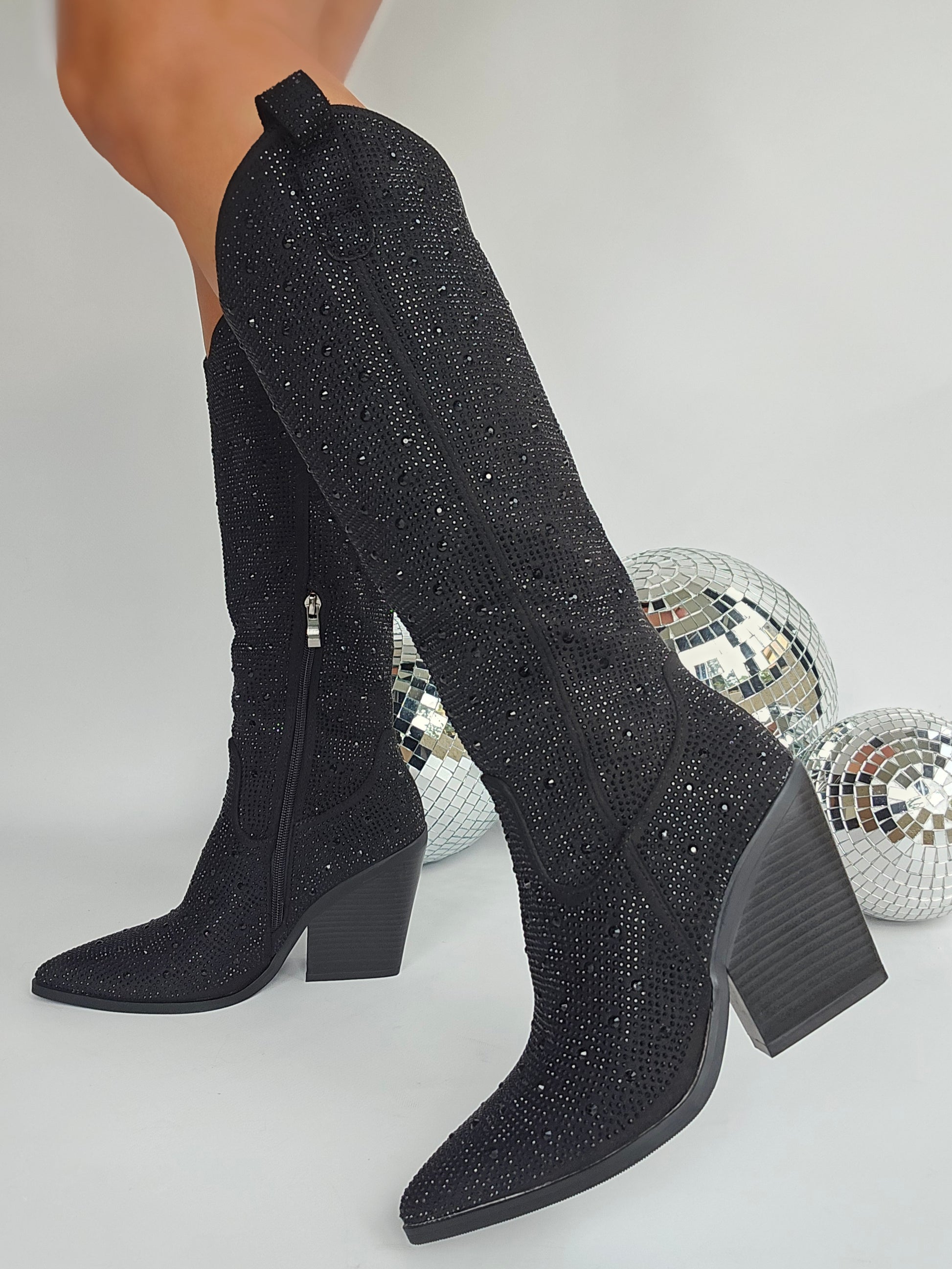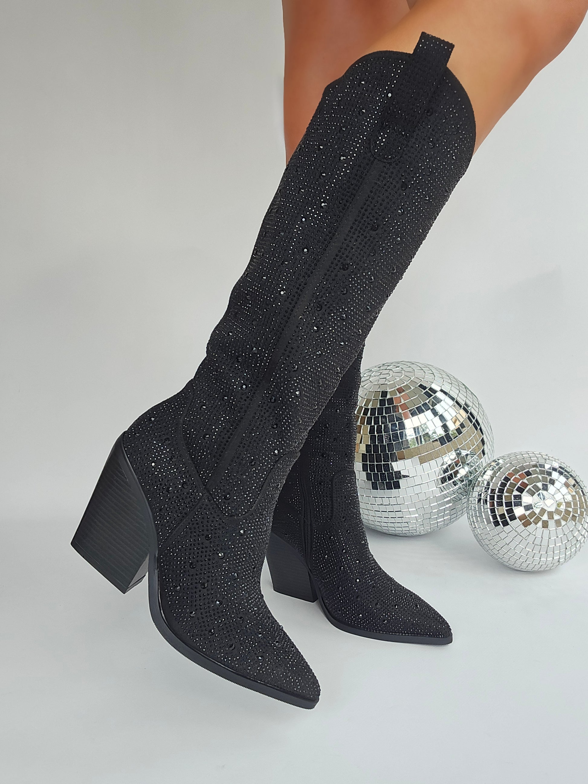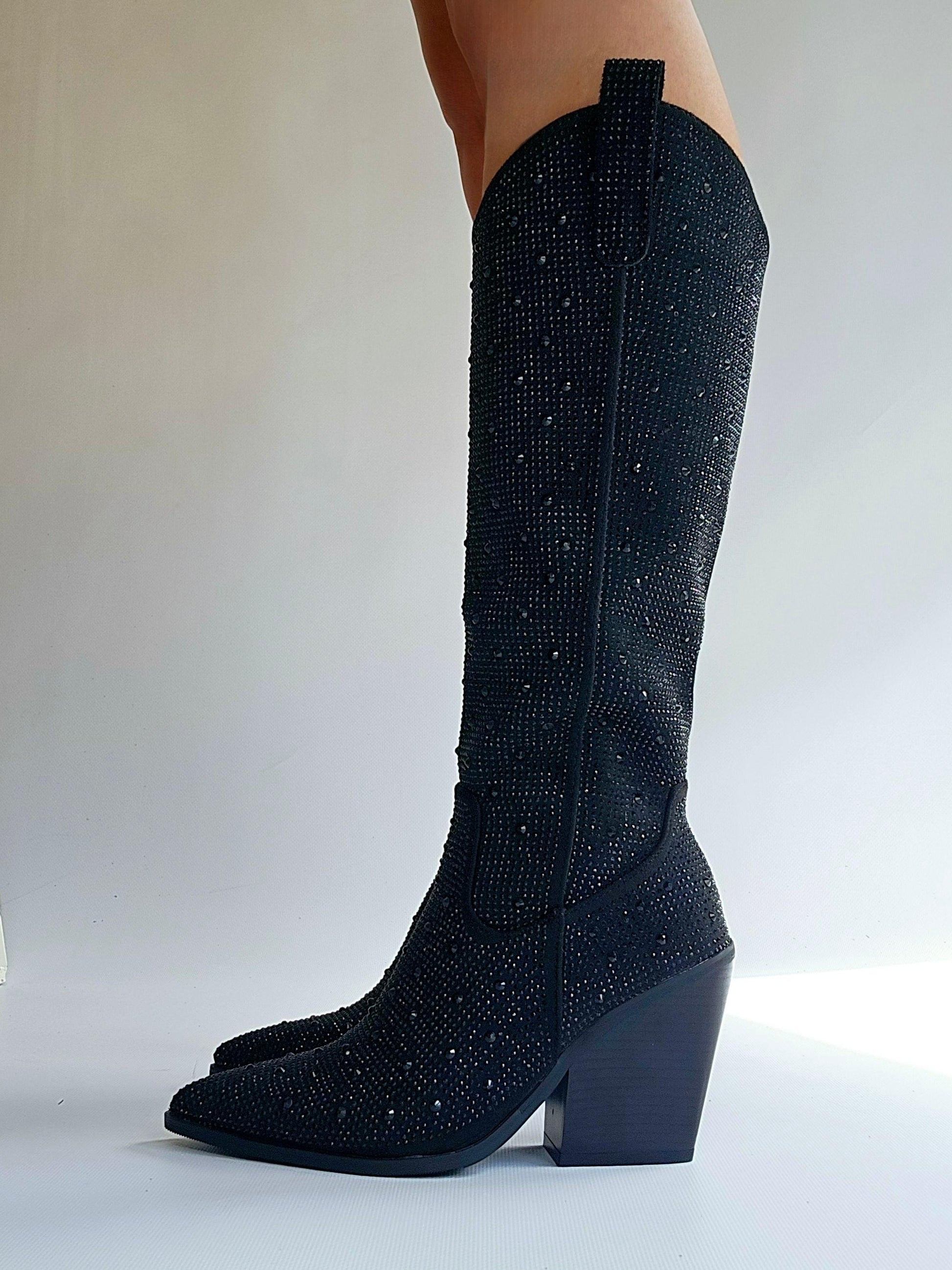 Sublimez votre silhouette avec ces bottes santiags en noir, ornées de strass étincelants pour un look glamour et audacieux. Avec un talon de 9 cm, elles allongent élégamment la silhouette tout en apportant une touche de sophistication. Leur fermeture pratique facilite l’enfilage, mais leur coupe ajustée convient mieux aux mollets fins ou standards.