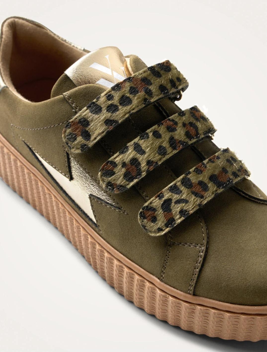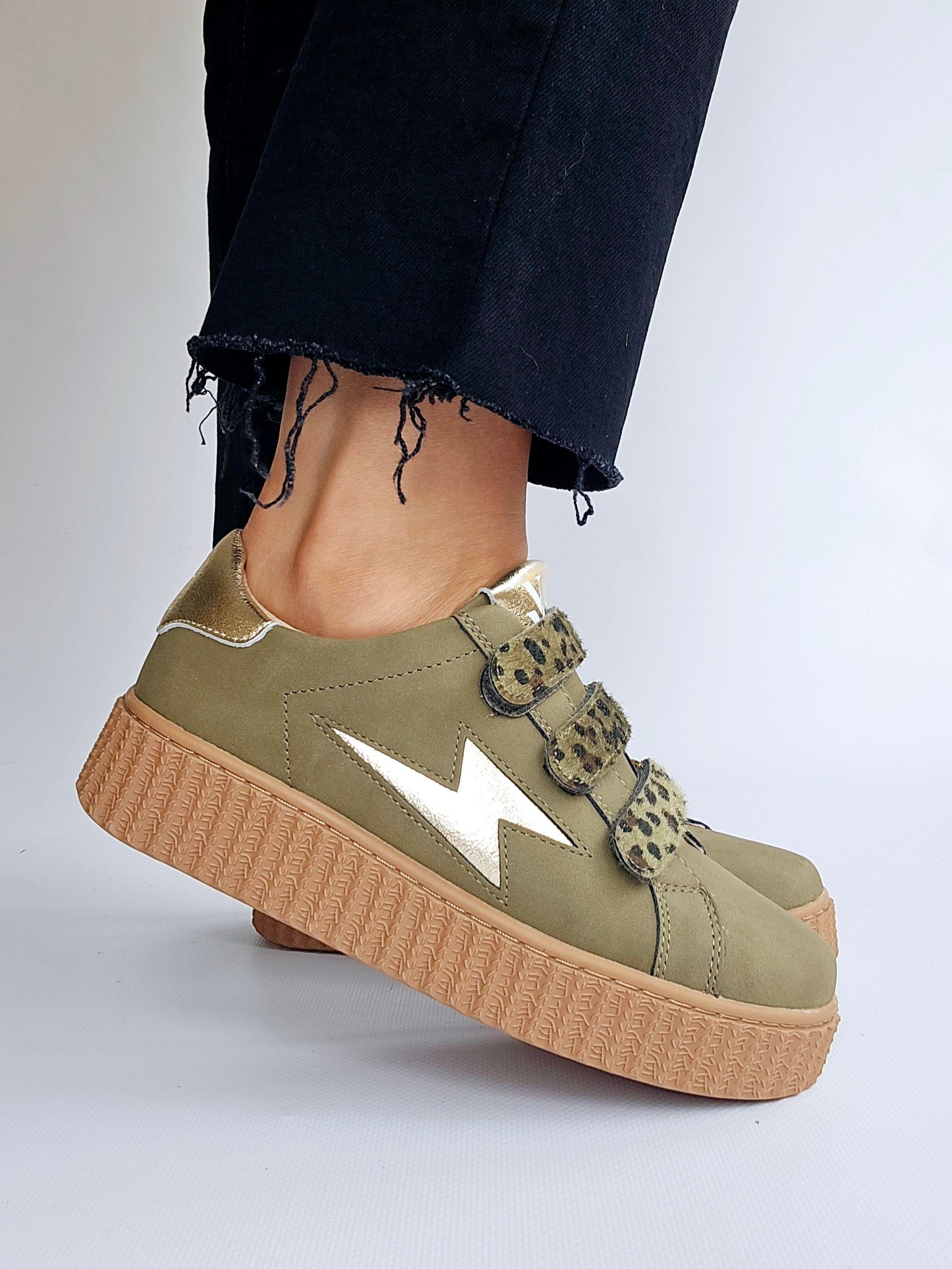 - Fermeture à scratchs vert kaki effet poulain imprimé léopard