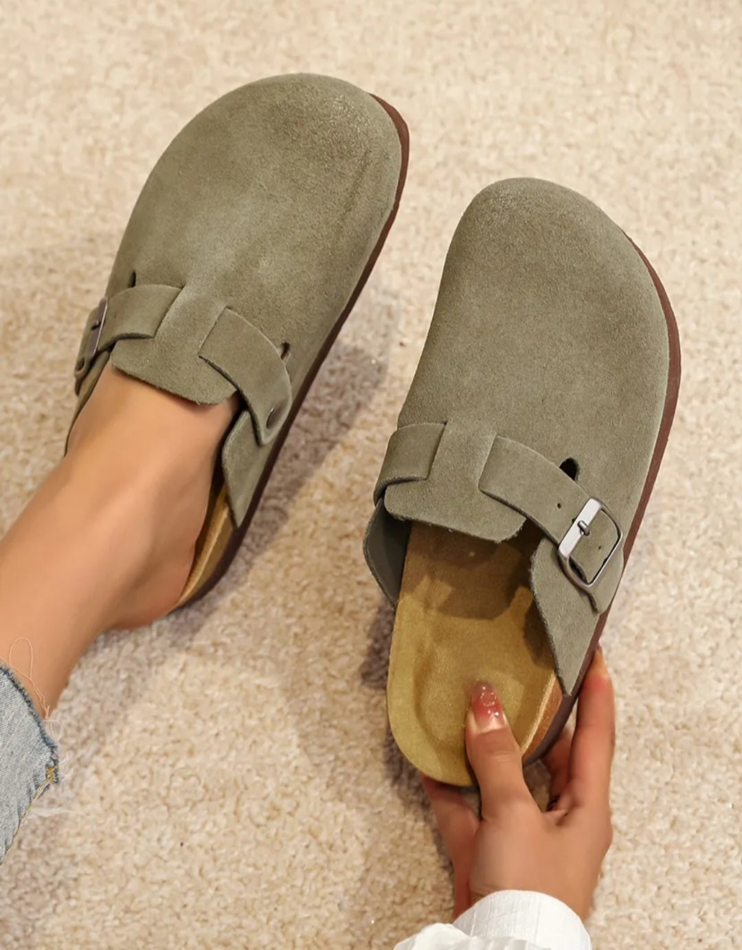Khaki Leather Platform Mules