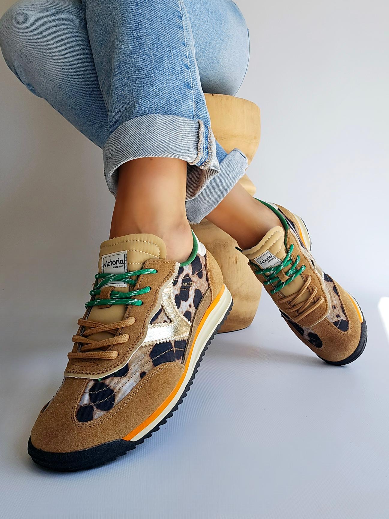 • Léopard & Camel : association léopard et camel, V doré, lacets ronds verts et touches orange sur la semelle pour un look audacieux.