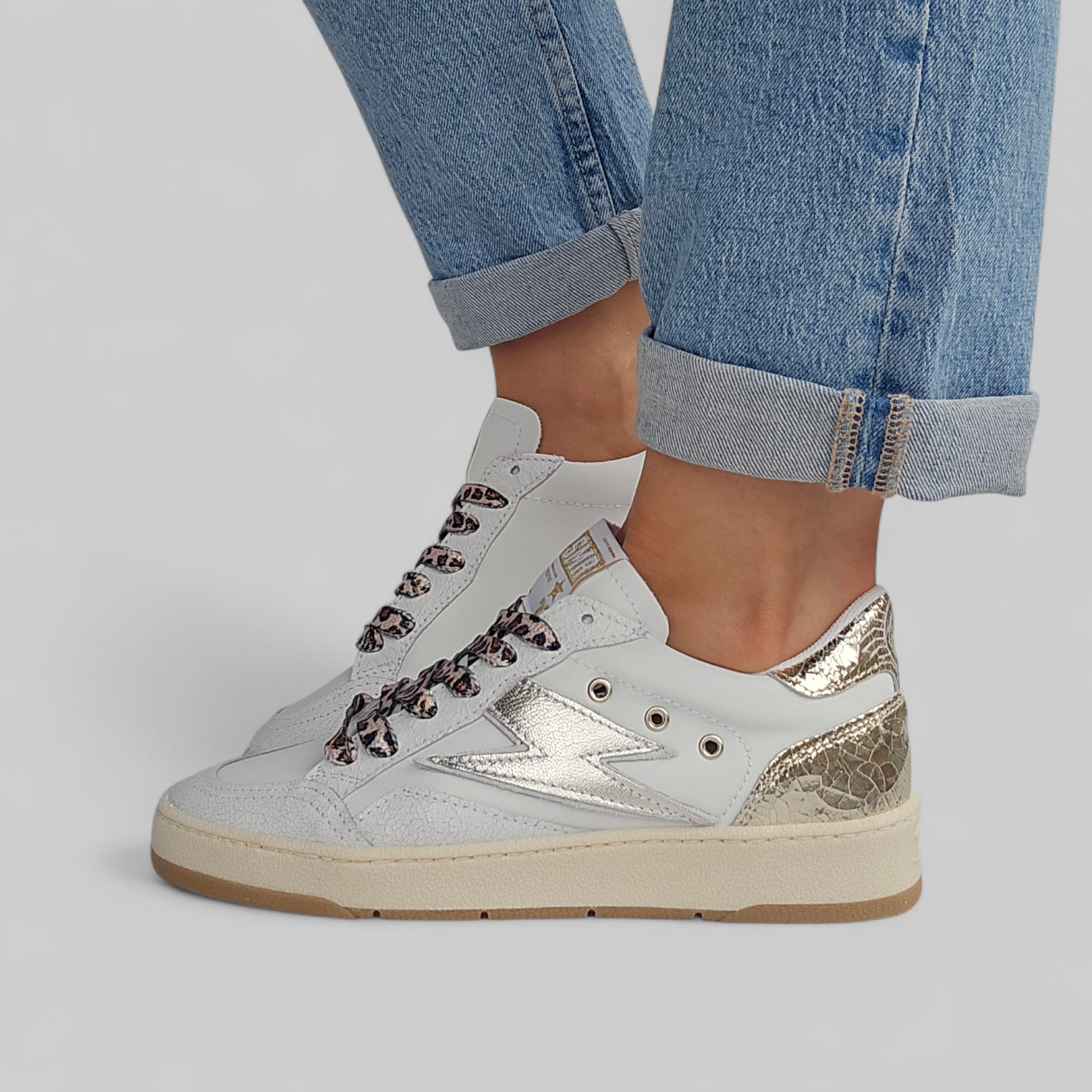 L’éclair argenté pastel, très doux et délicat, illumine la basket avec élégance, tandis que l’arrière doré craquelé apporte une finition chic et raffinée.