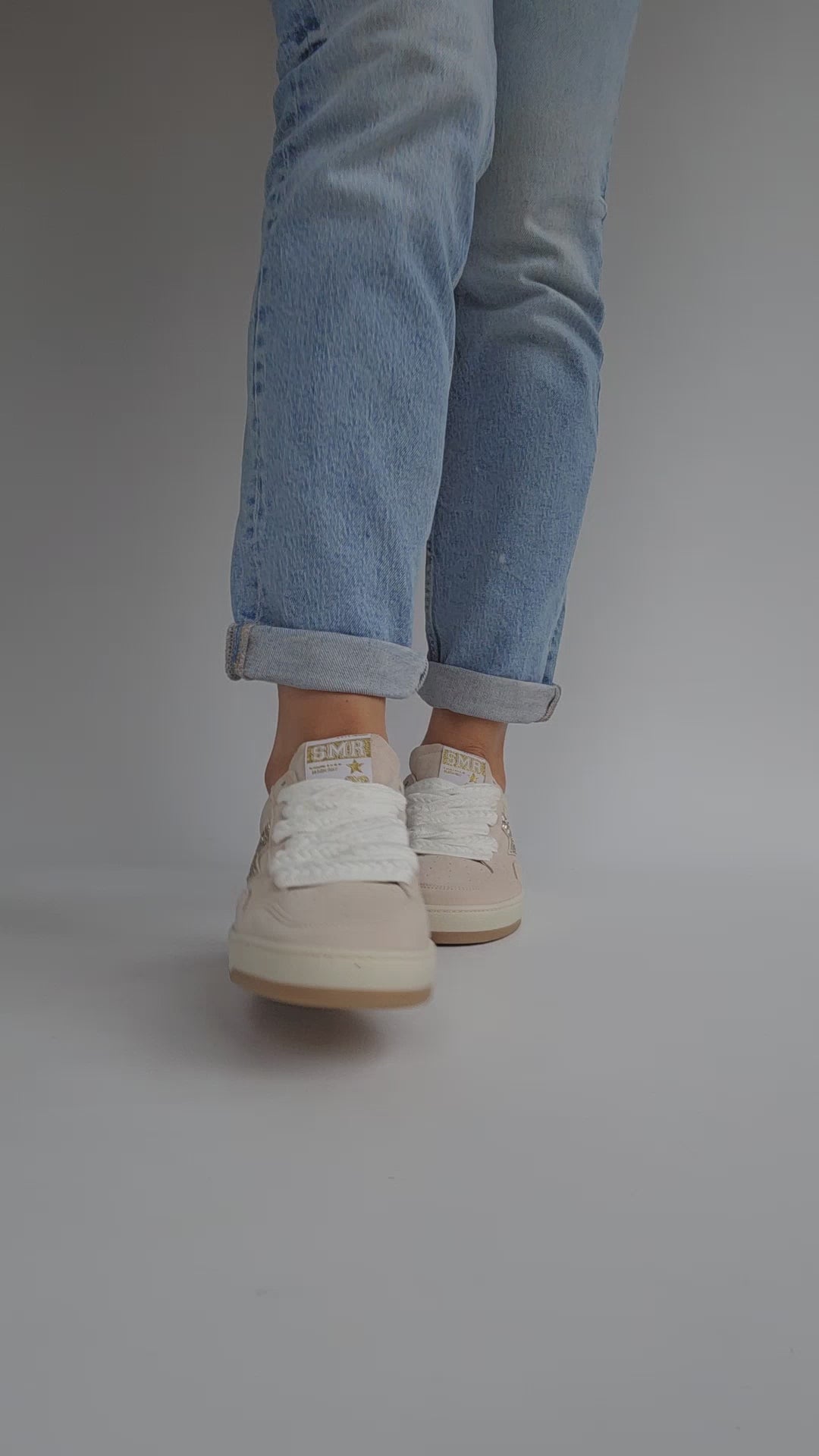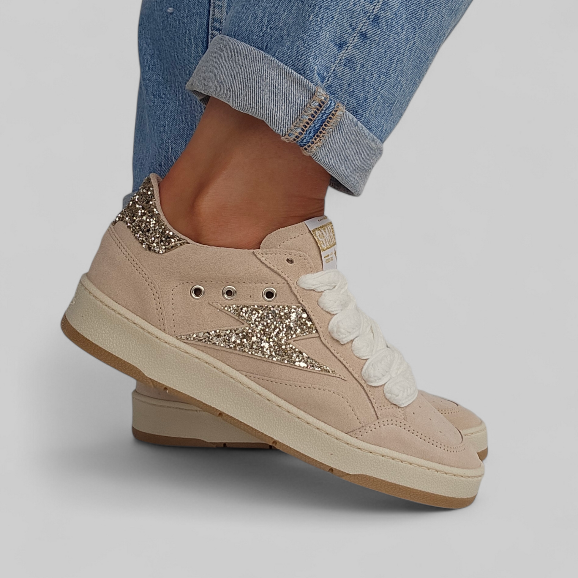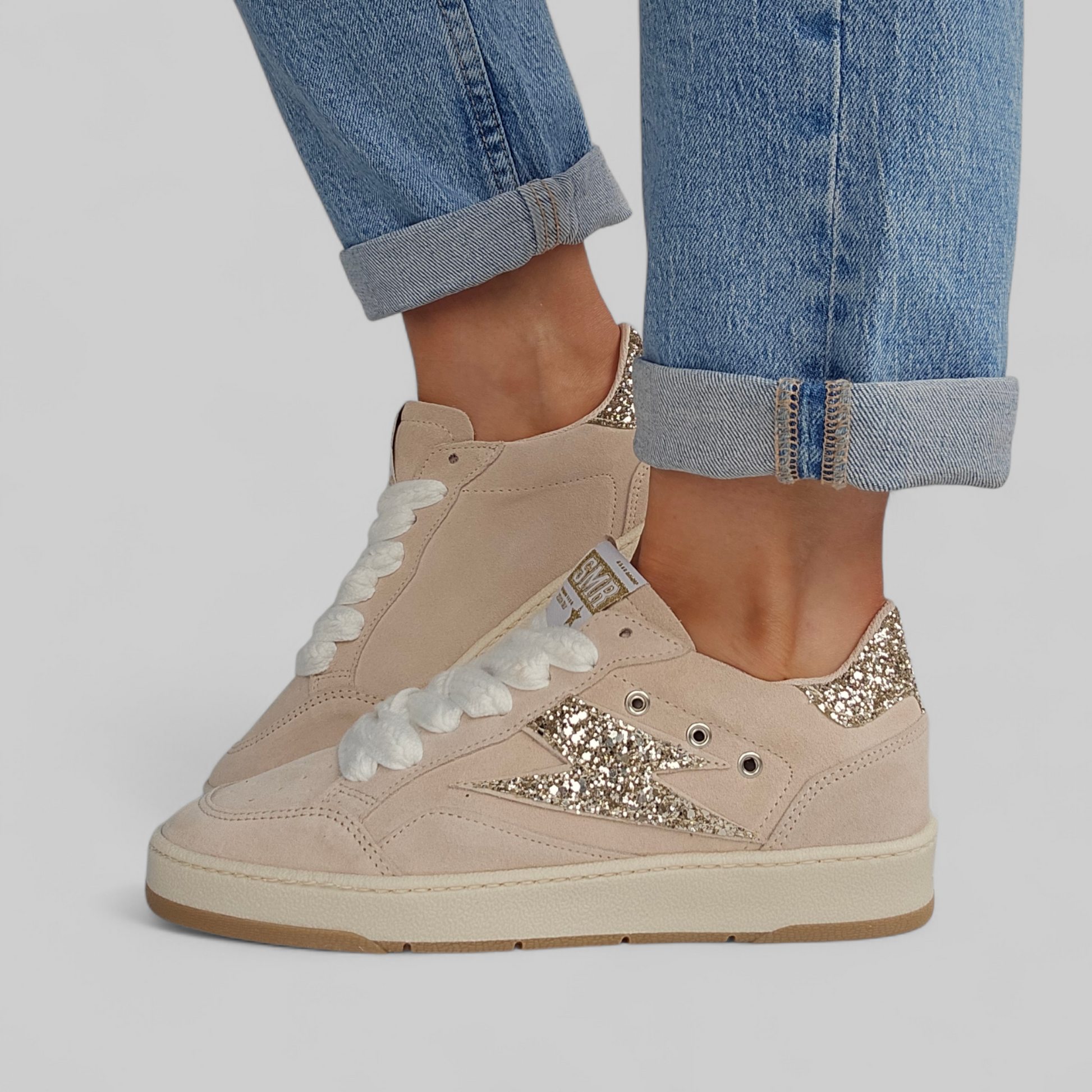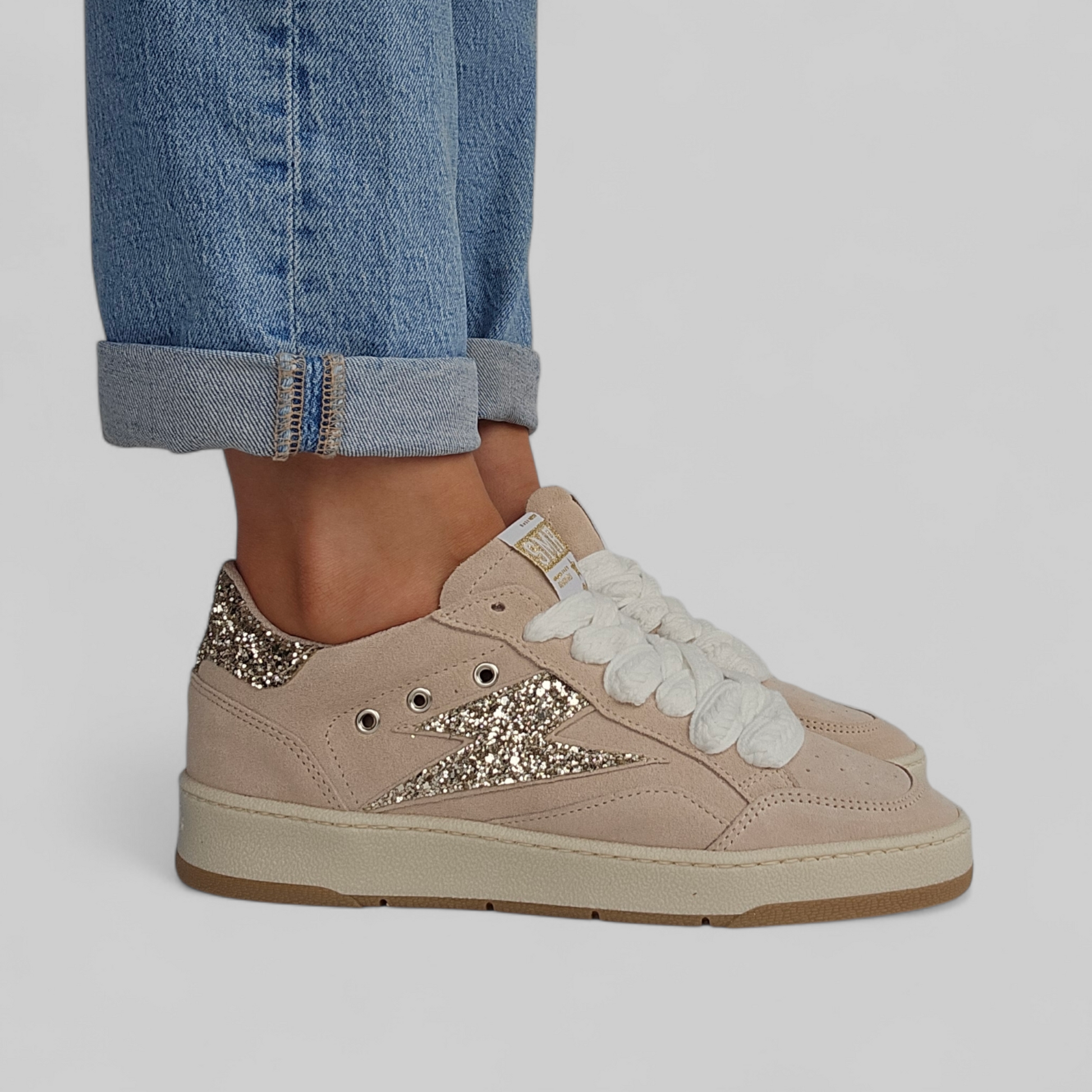 Les lacets larges légèrement tressés apportent une touche mode originale, tandis que l’éclair glitter argenté fait écho au détail argenté à l’arrière de la chaussure, pour un rendu harmonieux et raffiné.