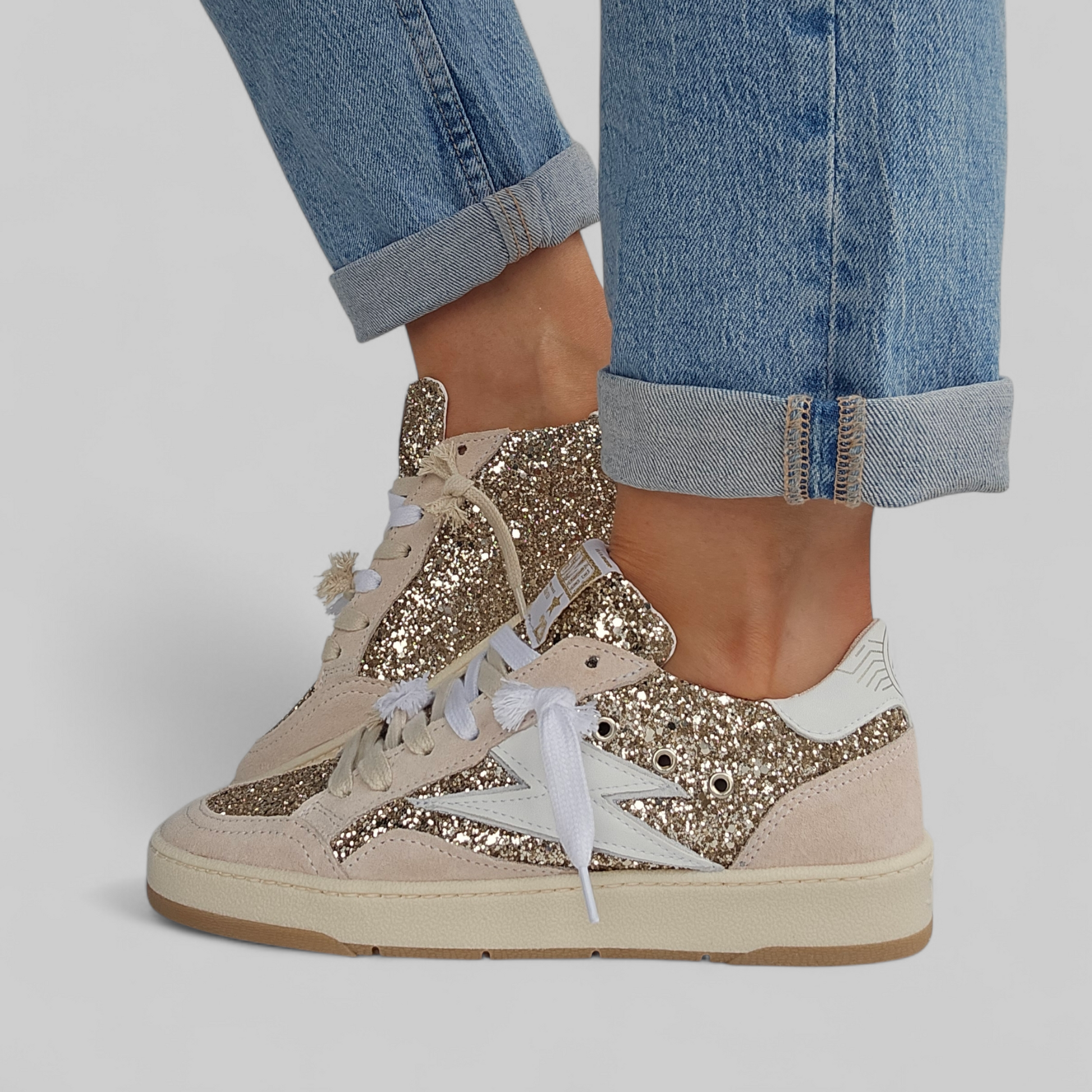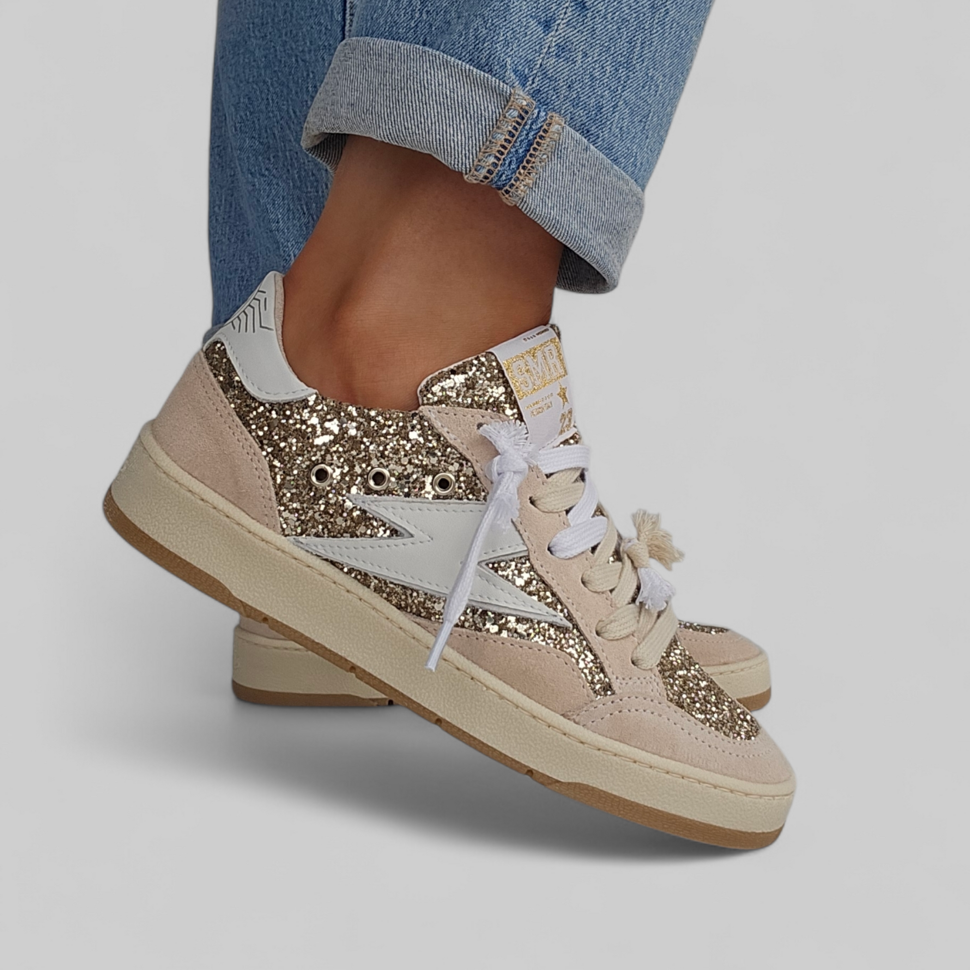 Matières : cuir lisse, cuir crack et glitter