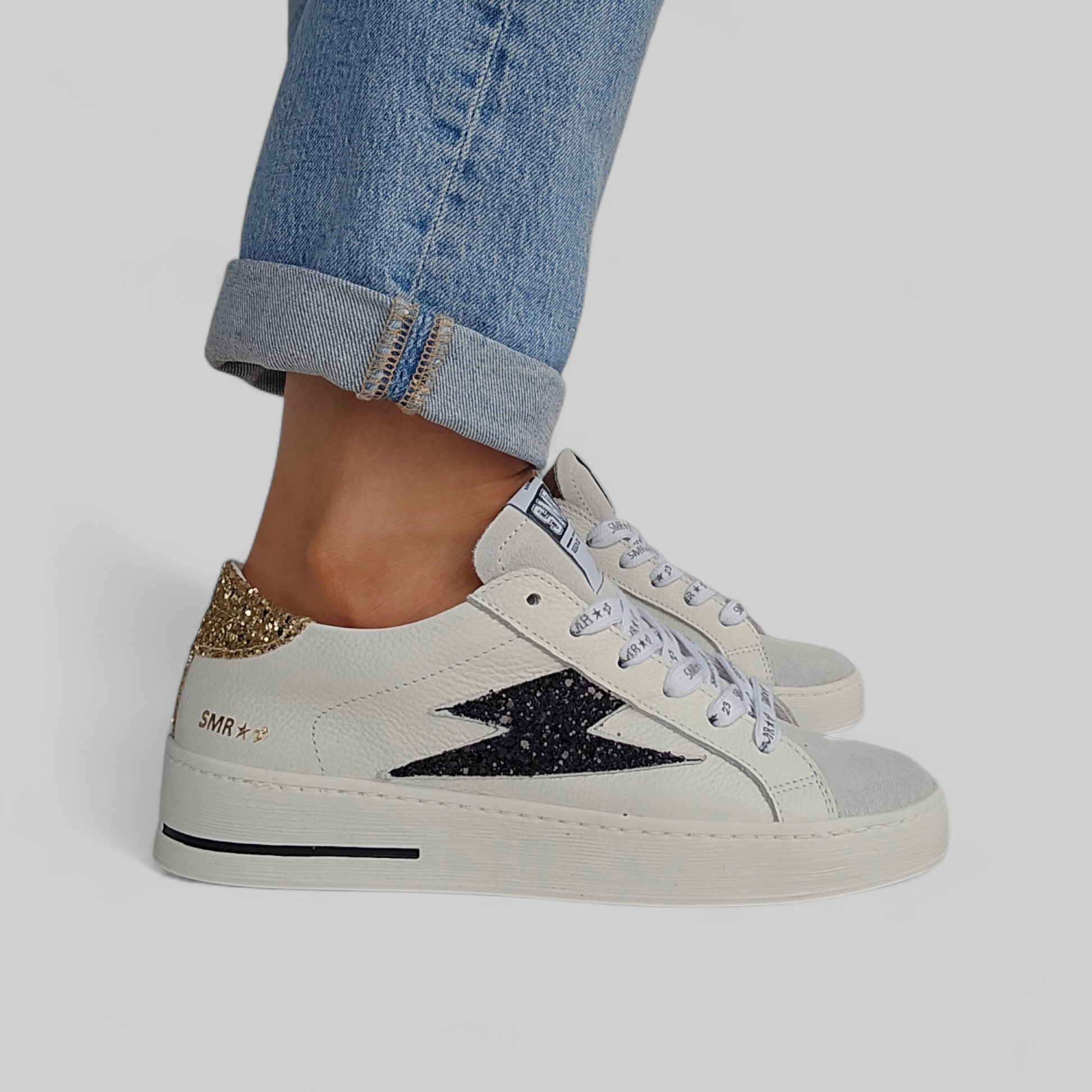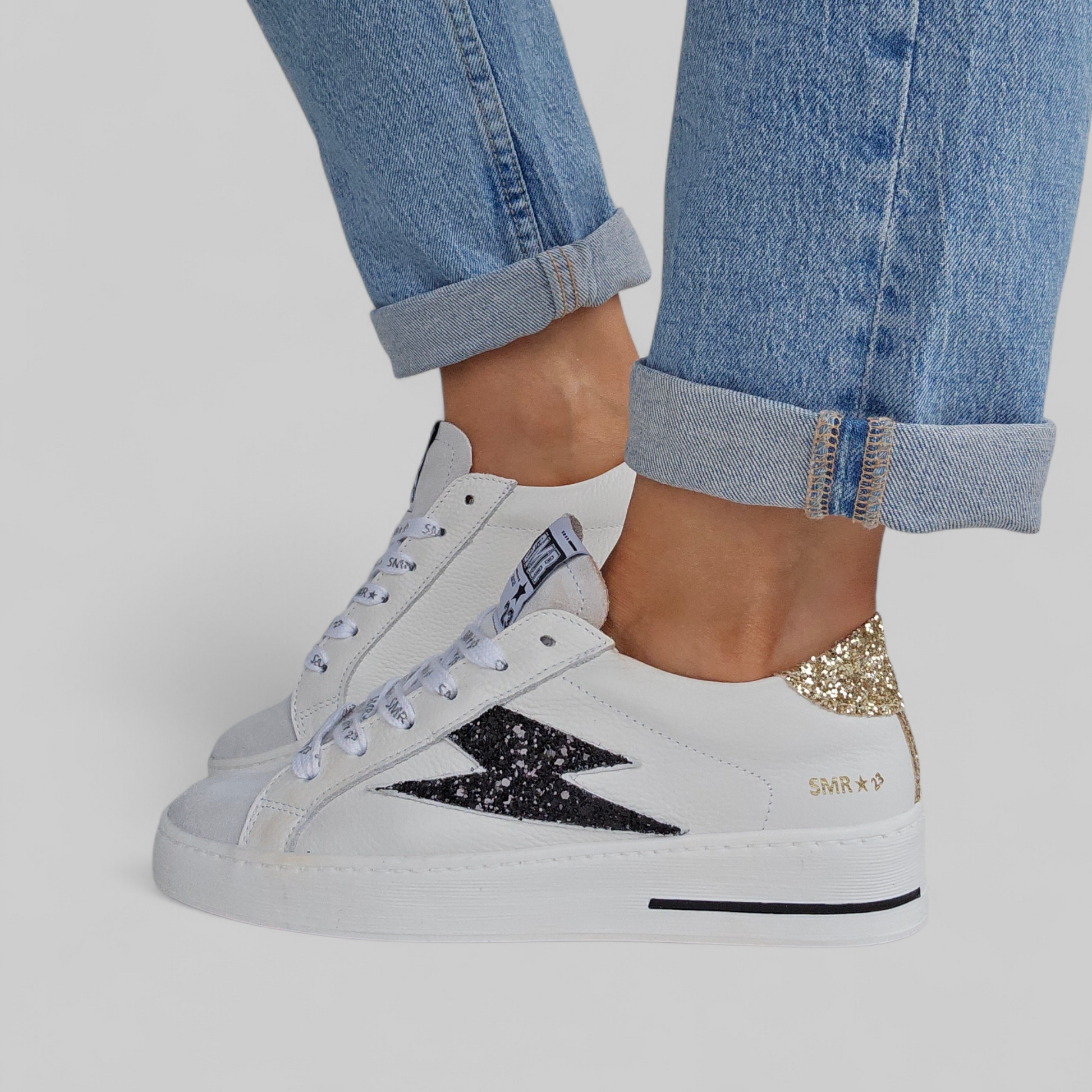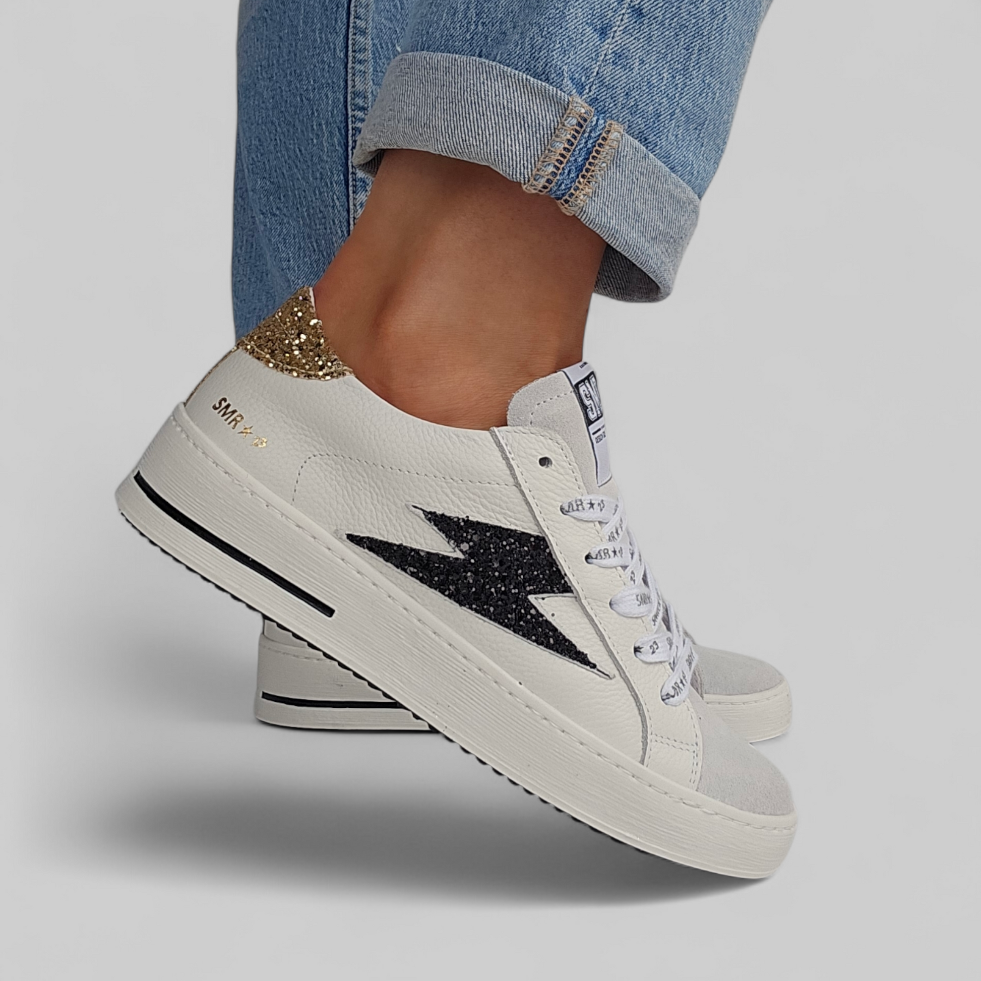 Son cuir blanc lumineux est rehaussé par un éclair glitter Noir, pour un rendu chic, facile à associer et très élégant au quotidien.