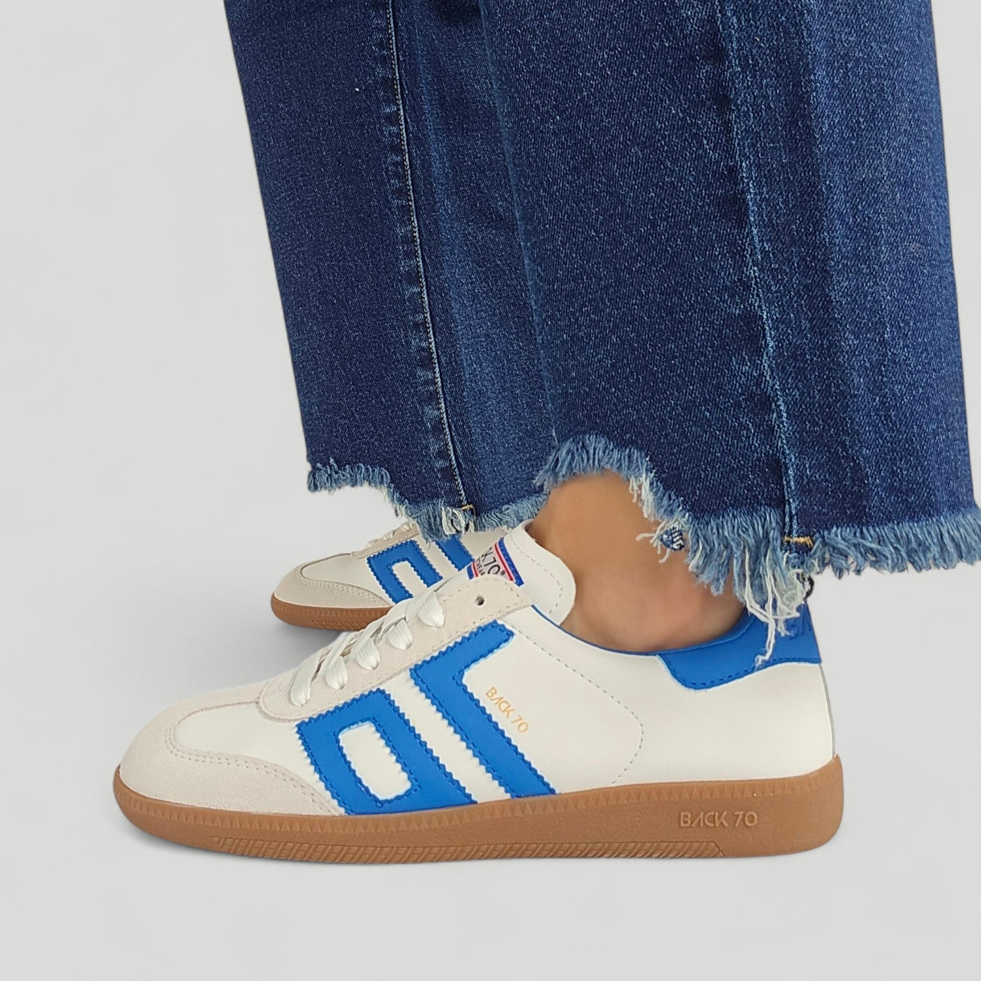 Inspirées des années 70, ces sneakers mêlent cuir blanc, suède beige et détails bleu vif. La semelle en gomme marron et l’emblématique logo « 70 » soulignent leur allure sport-chic. Elles apportent confort et caractère à toutes vos tenues.