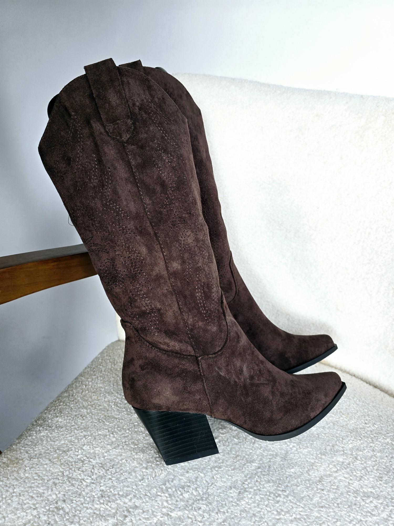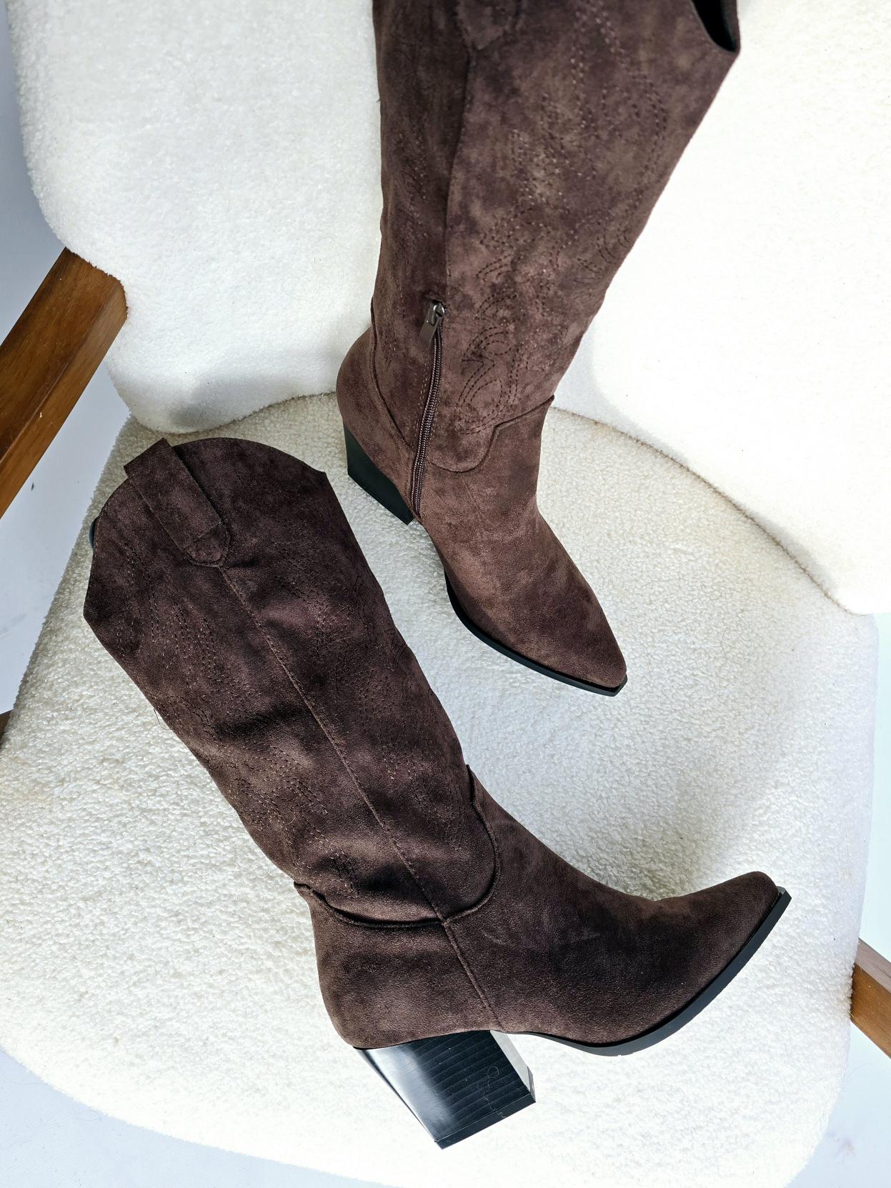 Apportez une touche d’élégance à votre look avec ces bottes santiags brodées en suédine chocolat.